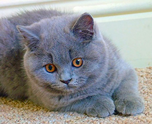 英国短毛猫身体短胖,肌肉结实,成年公猫比母猫体型大很多。脸圆,并会有颈垂肉。耳小耳尖呈圆形,眼睛为深金色,橙色或铜色。颜色方面则有很多,普遍可见的是蓝色及乳白色。一般来说,纯色的英国短毛猫被毛不应带有虎斑纹,而且色泽要均匀,并有同色掌垫,若是带有虎斑纹的单色英国短毛猫,则有可能是杂交品种了。英国短毛猫的被毛像绒布一般柔软、厚实,很少脱落,容易打理。