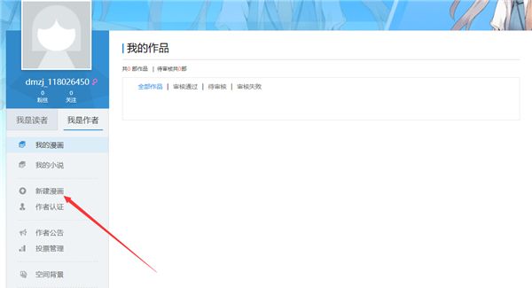(1)通过网站右上方导航栏的“上传漫画”按钮或者个人空间->我是作者中的“新建漫画”进入漫画创建页面。