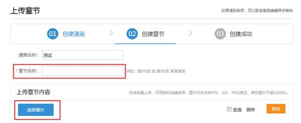 (1)、在创建章节页面,填写章节标题,并点击选择图片按钮上传图片,最后点击确定按钮即发布成功。