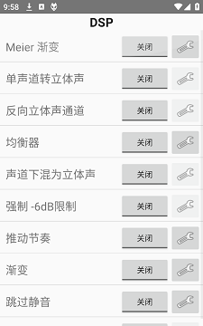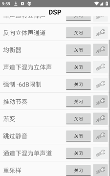 3、foobar2000所有DSP设置,每一项都可以单独打开或关闭,有深色扳手图标的,还可以继续点击,进行更细微的调整,浅色扳手图标不能细微调整,只有打开和关系选项