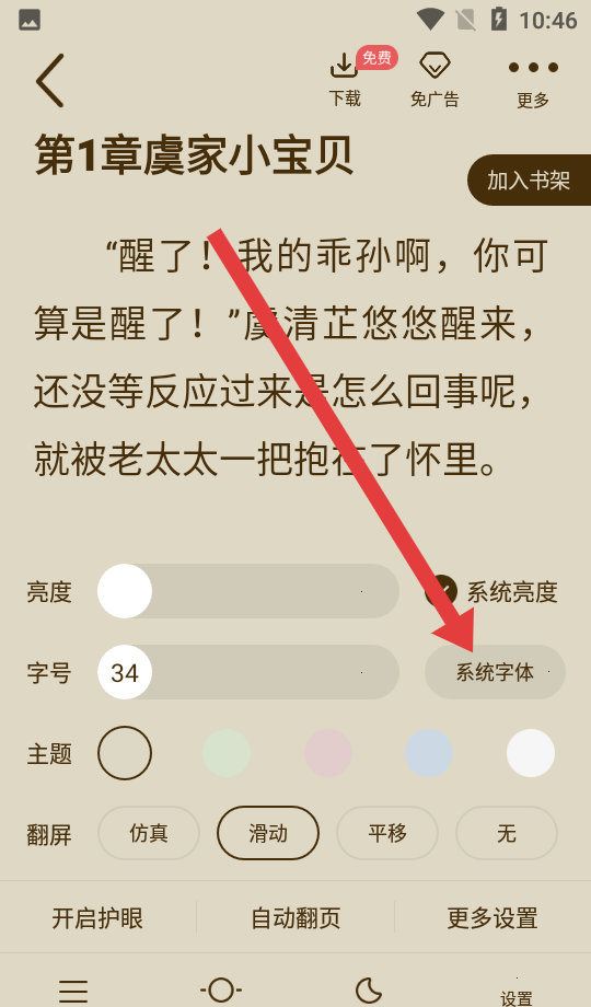 4、在设置菜单里,找到字号旁边的系统字体选项,来更改小说字体样式。