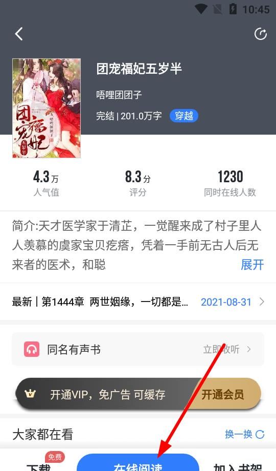 2、进入小说详情页,点击在线阅读进入阅读界面。