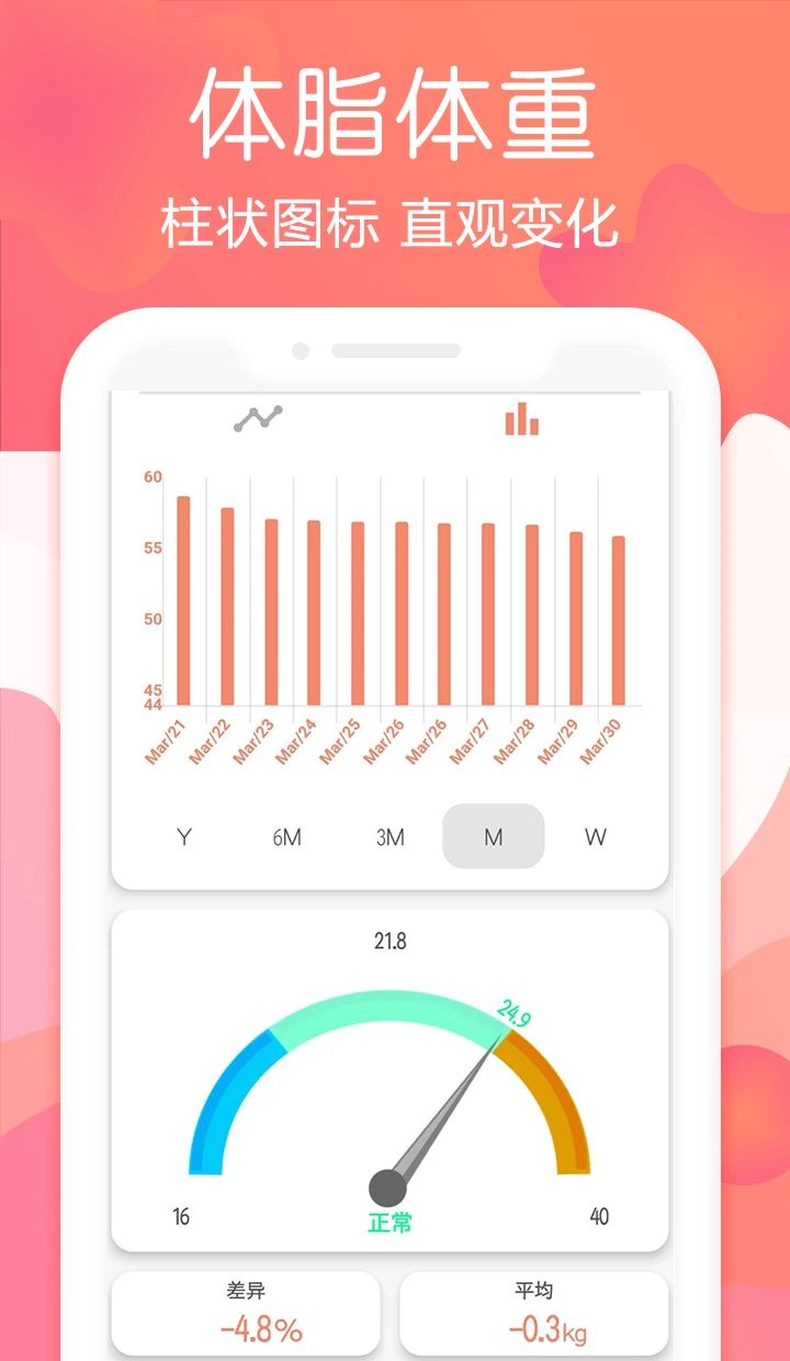 3、数据可视化:通过条形图直观记录体重、目标完成情况、身体状况等指标,清晰严谨。