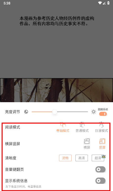 5、点设置,可以看到支持亮度调节、阅读模式切换、横屏竖屏、清晰度、音量键翻页、显示系统信息等设置。