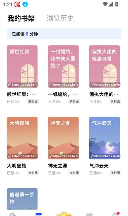 2、在书架界面下,我们可以收藏一系列小说,这样一来就能够及时获取到最新的小说更新章节。