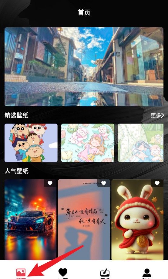 1、首页展示丰富壁纸资源,包含精选与热门分类,点击任意图片可查看与收藏下载操作。