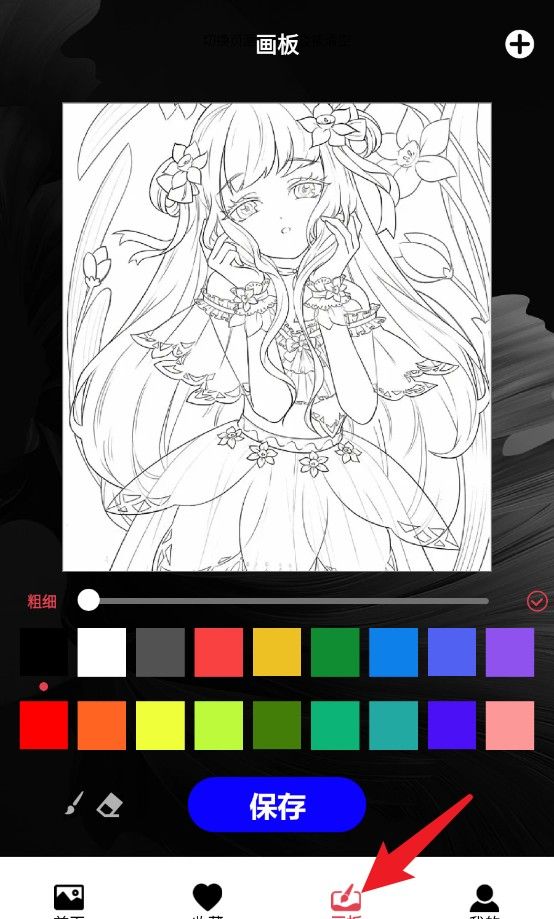 3、画板功能提供多种颜色工具,可对线稿图进行自由涂色,完成后点击保存按钮。