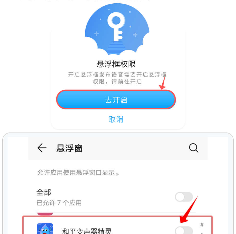 如果没有授权过会提示授权,请按照提示点击跳转,找到【悬浮窗】权限开启。由于安卓手机系统差异太大。如果不能正常跳转到权限界面,请手动到权限界面开启。