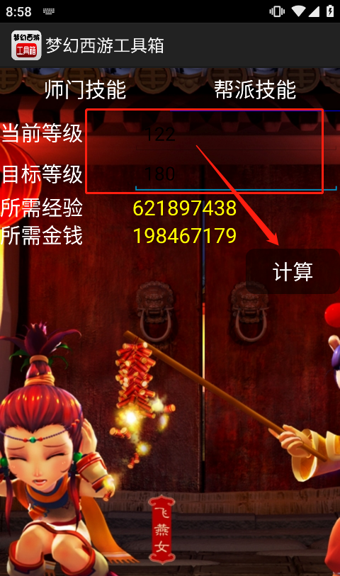 3、技能计算中与上述角色等级升级计算器用法相同,在输入栏中提供当前等级以及目标等级即可提交计算,一键得出所需的经验、金钱。下图所示为帮派技能的演示效果,师门技能的用法也与其相同