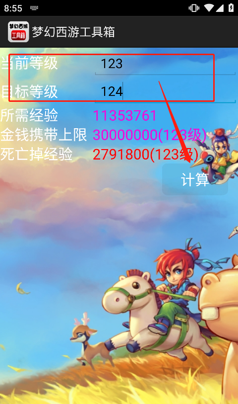 2、进入人物等级升级计算中,我们需要输入当前等级以及目标的等级日还惦记最下放计算,即可得到所需的经验、金币携带上限、死亡掉经验等各项数值