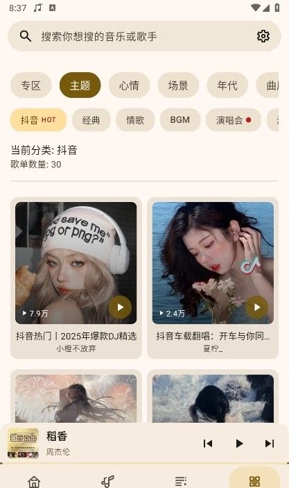 1、点击首页搜索框,输入歌曲名、歌手名或专辑名,支持模糊搜索(如“周杰伦”或“稻香”)。