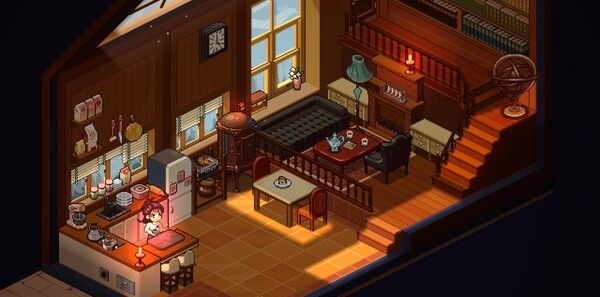 采用等距视角的2D像素艺术风格,画面色彩鲜明,充满童趣。像素风的画面营造出温馨、怀旧的氛围,让玩家仿佛置身于一个梦幻的童话世界。小镇的建筑、居民和家具等细节都刻画得十分精致,展现出独特的艺术魅力。