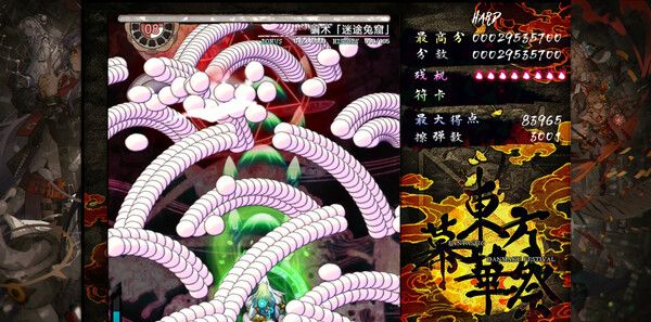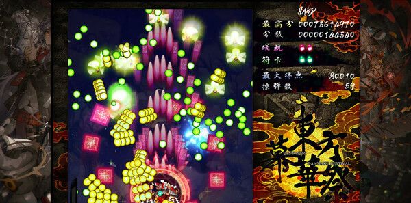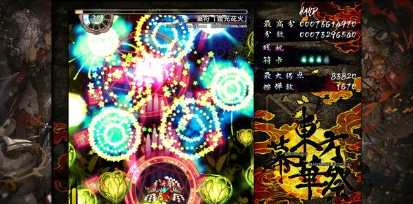 延续系列经典的纵版弹幕玩法,玩家可操控角色在密集弹幕中灵活走位,通过“低速移动”精准躲避,搭配符卡(Bomb)全屏清场。不同角色拥有专属技能,如灵梦的“梦想封印”可冻结弹幕,魔理沙的“极限火花”能穿透多重护盾。