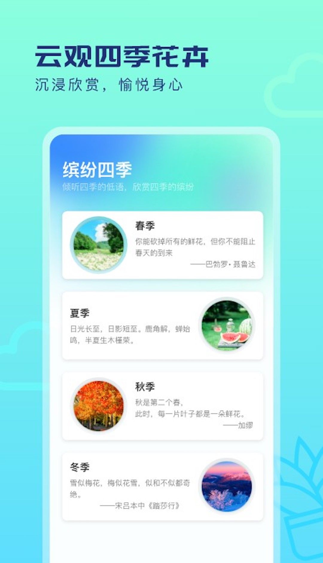 早看天气,让天气生活早知道。它采用权威且精准的天气数据源,时刻为您监测天气变化,确保您获取到的天气信息始终是最新的、最准确的,彻底告别天气数据更新不及时带来的困扰。其15日天气数据预测功能,更是支持超精准天气预测,让您对未来的天气趋势尽在掌握之中。此外,早看天气还独具匠心地推出了“云”观四季花卉功能,让您在指尖就能领略到大自然的四季变换与魅力,真正关心并丰富您的生活。
