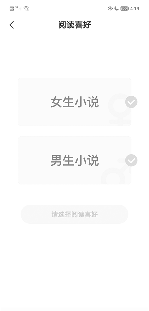 3、进入阅读喜好,选择阅读喜好类型,点击【确认选择】。