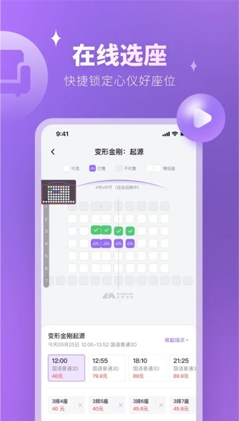 2、超快速购票:一键选座,通过微信或支付宝快速付款,30秒内完成整个购票过程,操作高效便捷。