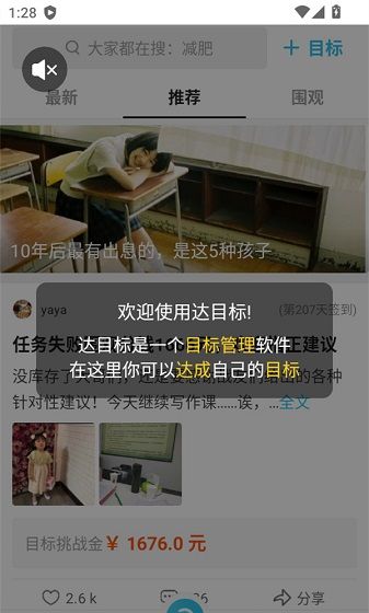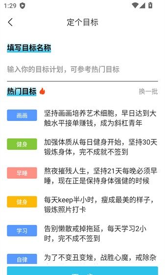 达目标是一款目标计划管理效率工具,拥有当下议论做高的几类日常项目与记录需求,包括从早睡早起、坚持跑步、减肥、锻炼、戒烟,到坚持背单词、画画、每天记账、战胜拖延症、戒游戏等项目。通过制定有效的目标任务,每日打卡与好友分享,做到一个有效的自我监督,让自己变得更自律更有效率。支持多个任务同时进行,比如早睡早起,健身跑步,读书学习。