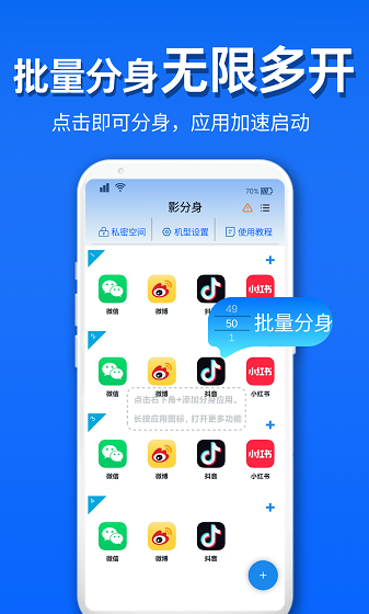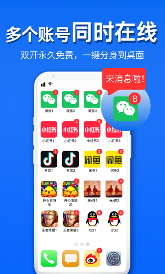 1、多开支持:支持微信、QQ、抖音、快手等主流应用无限分身,实现多账号同时在线。