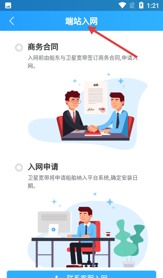 3、端站入网界面详细说明入网流程,先签商务合同,再申请入网,底部设联系客服入网按钮,引导用户操作。