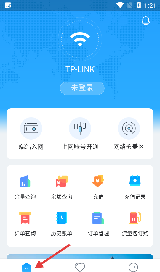 1、首页以蓝色为主色调,显示未登录状态,设有端站入网、上网账号开通等功能,方便快捷管理网络业务。