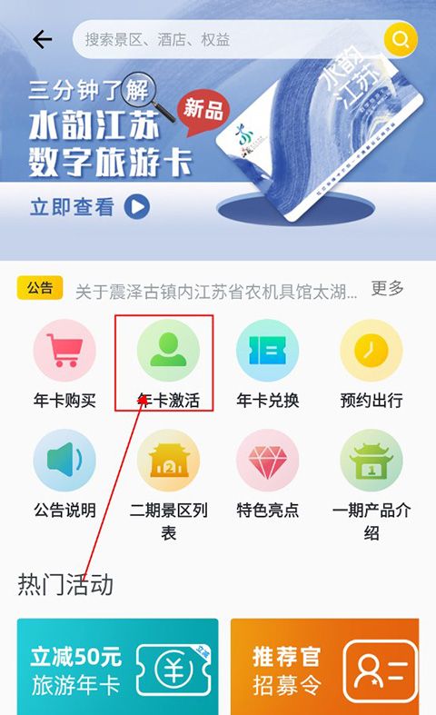在开通数字旅游卡之后需要先进行激活,在旅游年卡页面点击“年卡激活”即可。