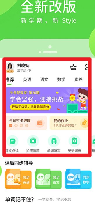 4、进入首页后,可查看学习进度与作业情况,支持课文点读、拍照搜题、单词听写、英语语音等学习功能。
