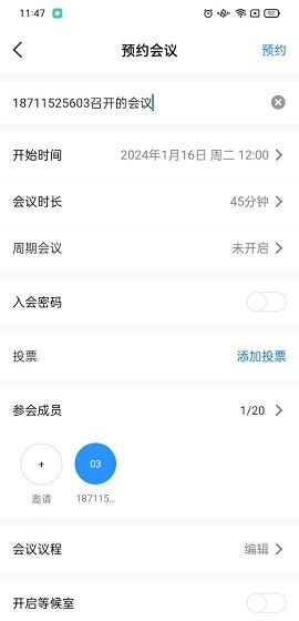 3、如果你是需要提前预约会议,点击预约会议设置时间、会议密码等相关设置。