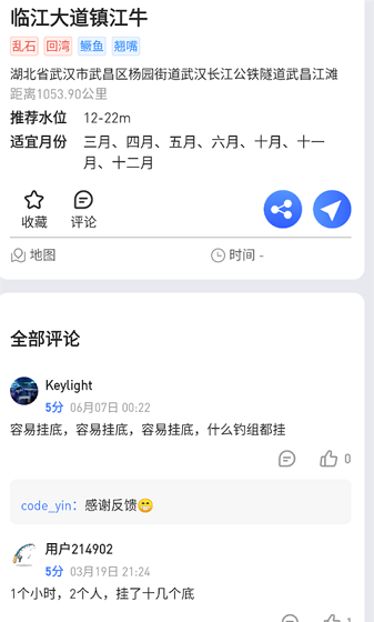 3、选择钓点进入,查看详细位置、推荐水位以及其他钓友的评价。