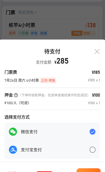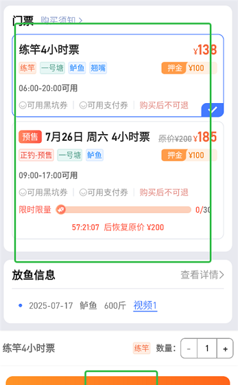 4、在钓点页面搜索到钓点后,进入购买界面,选择门票,点击提交订单。
