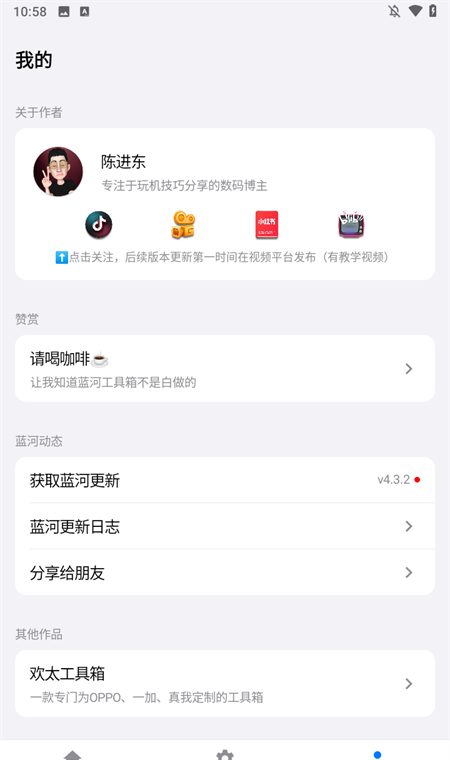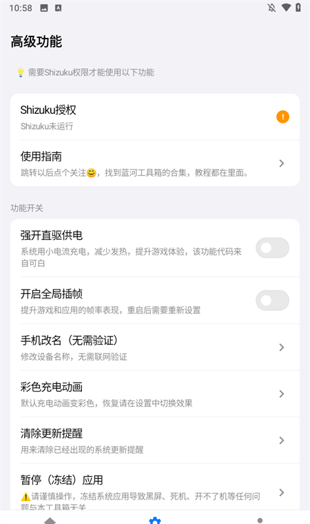蓝河工具箱是一款十分好用的手机工具箱软件,软件可以帮助用户解锁和启用手机系统深层隐藏的性能选项。用户在使用软件时可以通过授权激活全部高级功能,这样就可以让那些不支持高帧率的视频或者游戏画面变得更加清晰流畅,用户可以手动手改屏幕分辨率,平衡竟能与画质,提高玩家的使用体验。软件可以绕过系统限制,为手机提供更稳定、强劲的电力输出,当用户在玩大型手游的时候,耗电量降低和游戏运行都有流畅的体验,软件增强了内存管理功能,支持cpu超频。