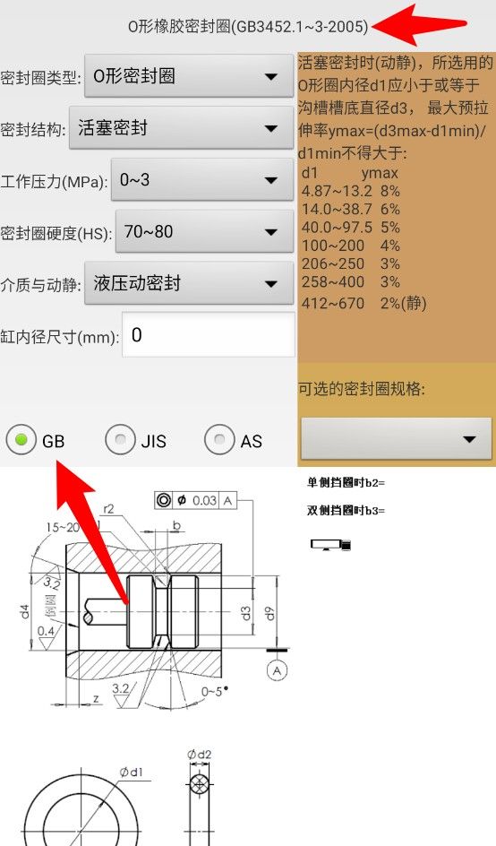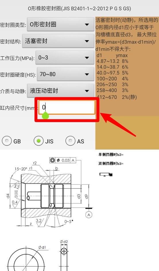 5、输入轴内径尺寸并选择密封标准(如GB、JIS、AS),系统自动生成图纸参数。