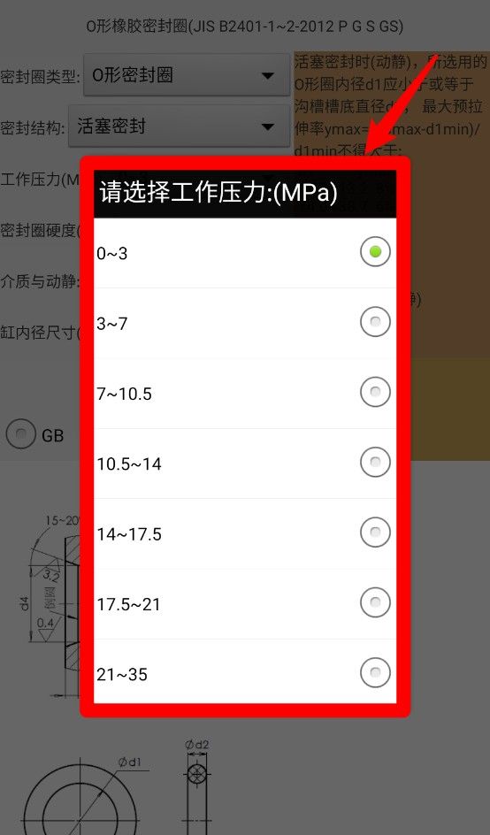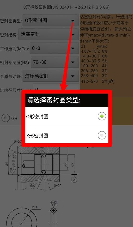 2、点击密封圈类型按钮可选择“O形密封圈”或“X形密封圈”等具体类别。