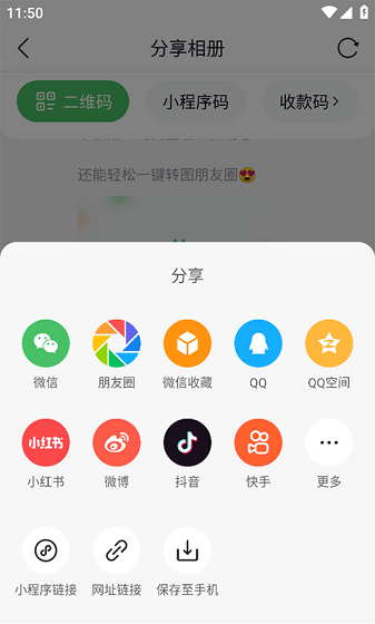 2、在分享相册页面将您的二维码展示给他人扫码即可分享相册,也可以点击下方的一键转发。