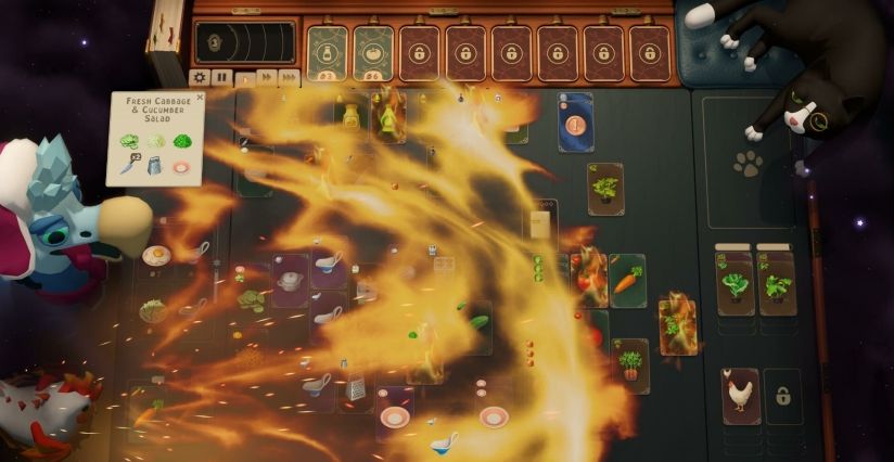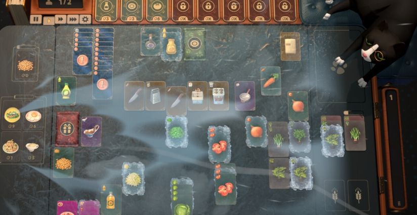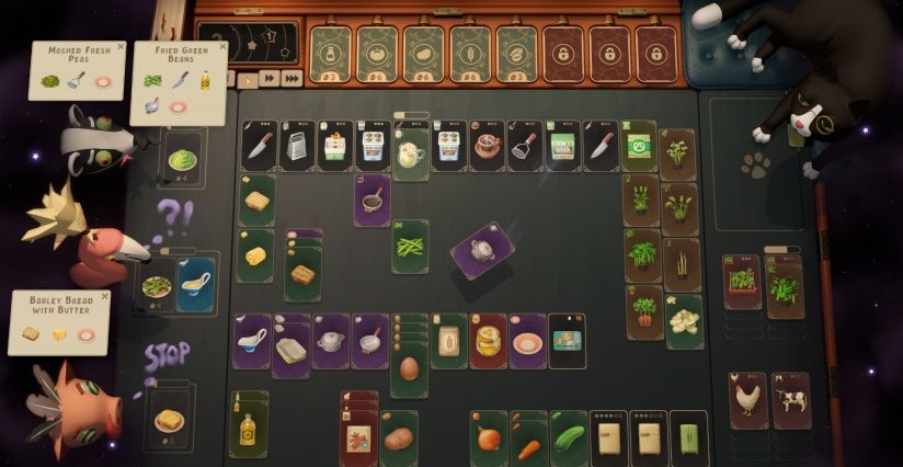 1、卡牌构筑:玩家需通过摆放卡牌制作菜肴,简化传统烹饪操作,强调时间管理和策略布局。