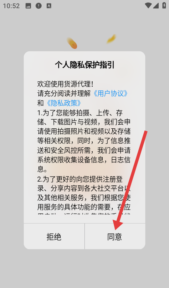 1、首次打开APP会弹出用户协议及隐私政策界面,需仔细阅读后点击同意才能继续使用APP,这一步是为了确保用户了解并同意平台使用个人信息的规则。
