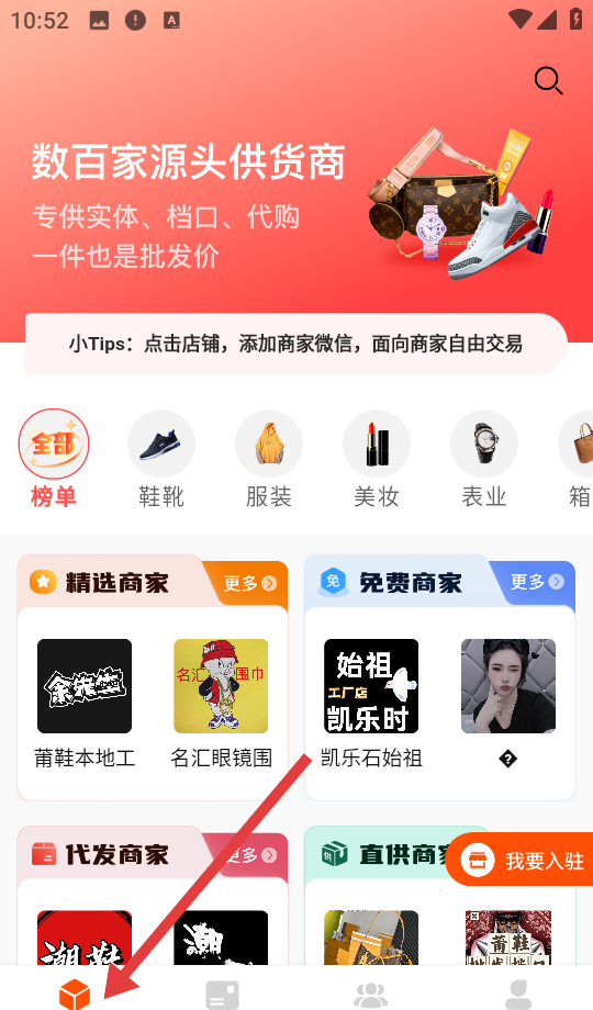 2、打开APP进入货源代理平台页面,顶部看到数百家源头供货商,专供实体、档口、代购,底部导航栏能切换货源、名片等页面。