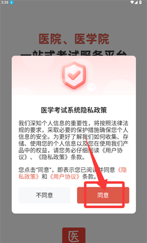 1、启动应用后确认医学考试系统隐私政策,点击同意按钮继续操作。