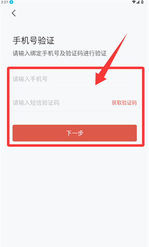 2、在手机号验证界面输入号码及验证码,点击下一步完成验证。
