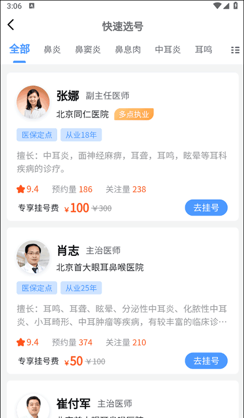 2、在快速选号当中找到并点击“去挂号”选项,进入具体医生详情界面;