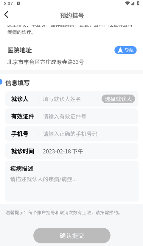 4、在预约挂号界面填写好就诊人姓名、有效证件、手机号、就诊时间、疾病描述后找到并点击“确认提交”选项;