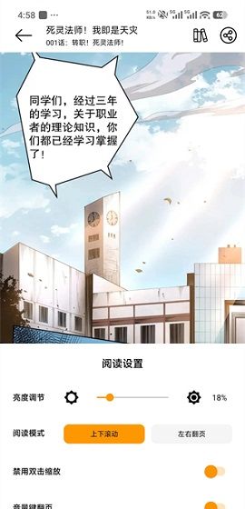 4、阅读中能调亮度、切换上下滚动/左右翻页模式,还能开音量键翻页。