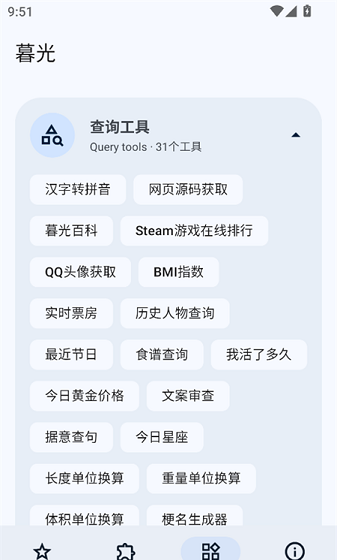 暮光工具箱是一款功能强大、专业实用的手机综合性工具箱软件,软件不仅采用了纯净无广告的操作界面而且更是加入了合理的功能布局,相关用户在这里只需动动手指便可以在这里进行壁纸资源设置、系统垃圾清理、源码获取、百科查询、视频解析等一系列操作,这样一来就能够很好的满足了相关用户日常工作、学习方面的需求。软件还采用了非常小的存储空间,用户完全不用担心运行卡顿之类的问题。