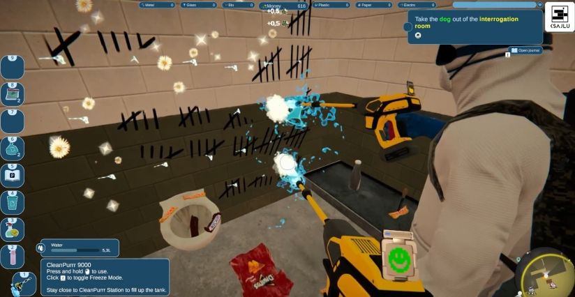 玩家可以在各种荒诞而令人满意的清洁工具之间切换,包括: