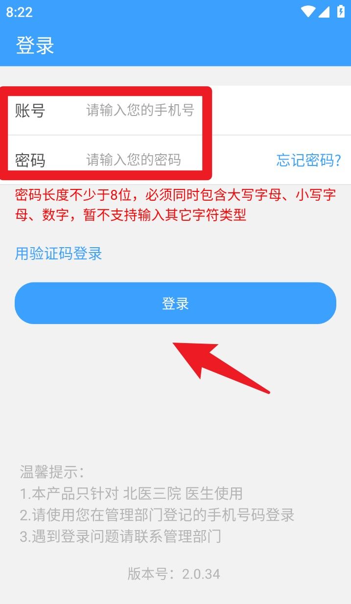 1、打开App后,进入登录界面,输入手机号和密码,点击下方的“登录”按钮,完成身份验证,进入系统。
