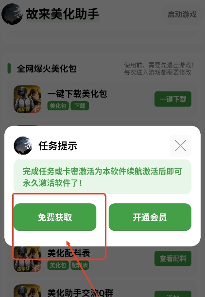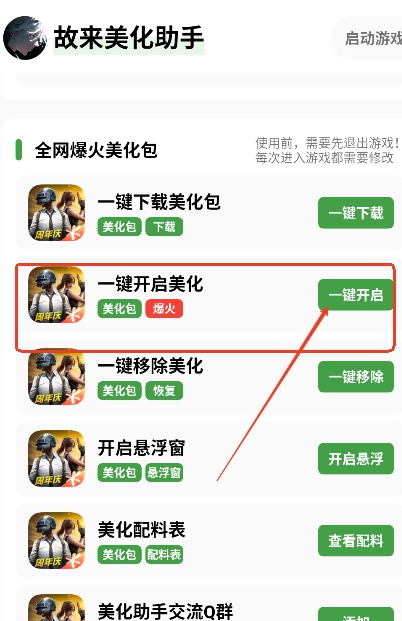 3、打开回到故来美化助手,点击“一键开启”,就能完成美化。