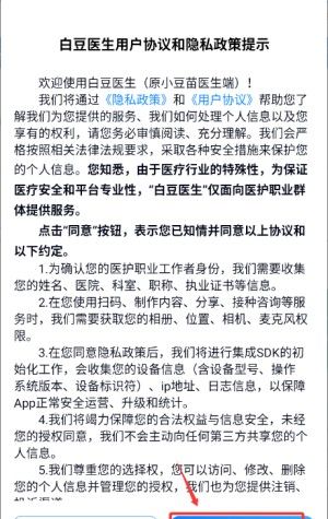 1、打开已安装的白豆医生,在软件的用户协议和隐私政策页面,点击“同意”选项。