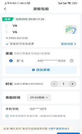 5、您也可以直接选择包船服务,输入旅客信息进行包船操作付款。