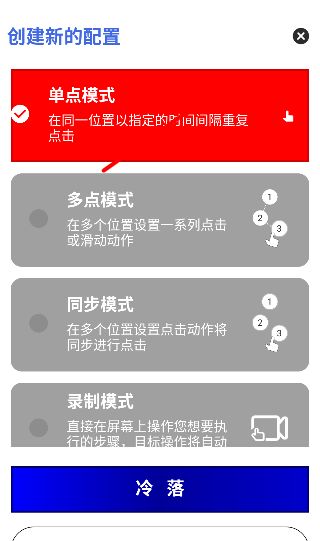冷落连点器是一种移动自动点击辅助工具,可以模拟用户操作,实现快速连续的点击,帮助完成重复的点击任务。冷落连点器软件支持自定义点击频率、位置和持续时间,具有多种内置触发模式,适用于游戏AFK、购物和抢票等各种使用场景。无论是快速完成日常任务还是优化工作效率,冷落连点器都可以提供稳定可靠的自动化解决方案,解放用户的双手,节省每个人的时间和精力!