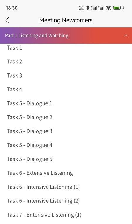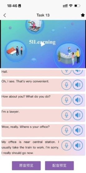 2、进入课程详情页面后,点击“开始学习”,根据课程内容学习,包括听力练习、口语阅读测试和实践练习。