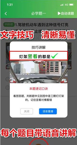 4、科目一和四中的每个问题都可以通过语音阅读和答案阅读技巧来阅读,关键词以红色突出显示。文本技能和助记符与文本、图像和语音相结合,使低识字率、单词识别能力有限和记忆力差的技能很容易通过。